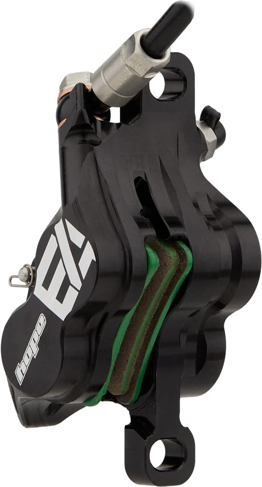 Die Tech 4 E4 von Hope ist eine hydraulische Scheibenbremse für den besonders anspruchsvollen All-Mountain- und Enduro-Einsatz. Sie kommt mit deutlich verbesserter Bremskraft im Vergleich zum Vorgänger Tech 3 und benutzerfreundlicherer Ergonomie. Geringere Federhärte und Industrielager gepaart mit hohem hydraulischem Druck sorgen für ein effizientes Bremsgefühl, das von den 4-Kolben-Bremssätteln kraftvoll umgesetzt wird.