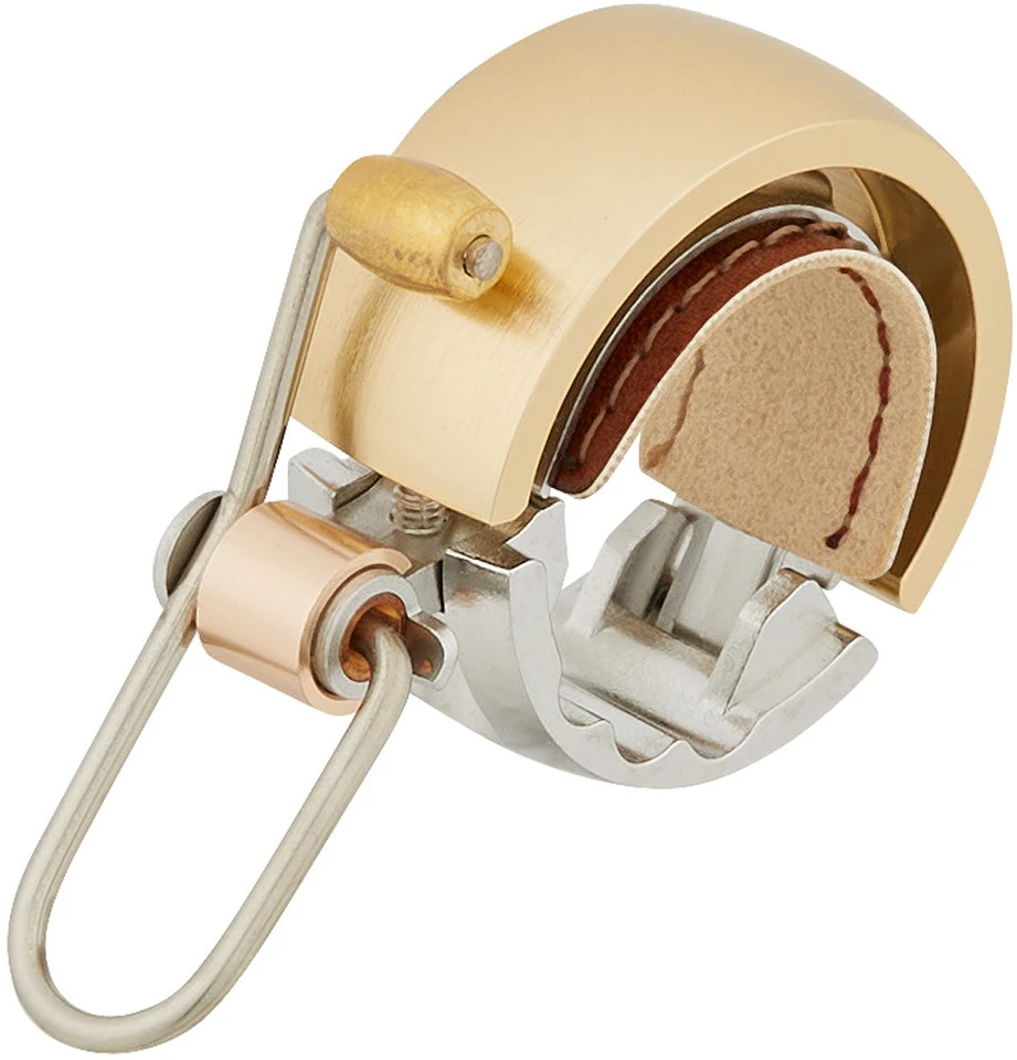 Optisch macht dieses Modell einiges her und der Klöppel im eleganten Messing-Finish sorgt auch für ordentlich guten Klang. Im Bereich der Lenkerklemmung beeindruckt die Klingel mit Lederapplikationen sowie Aussparungen für Kabel.